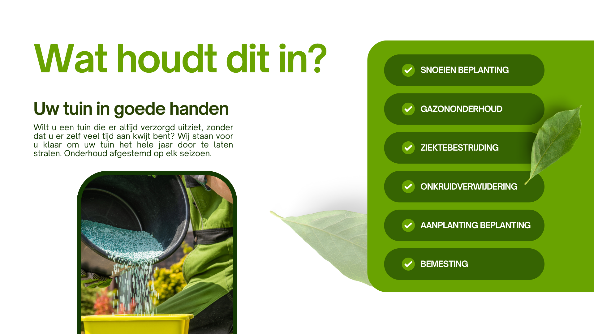 Met onze hulp blijft uw tuin niet alleen mooi en in balans, maar krijgt deze ook telkens een frisse en vernieuwende uitstraling. Een tuin die leeft, verandert, en altijd aantrekkelijk blijft.